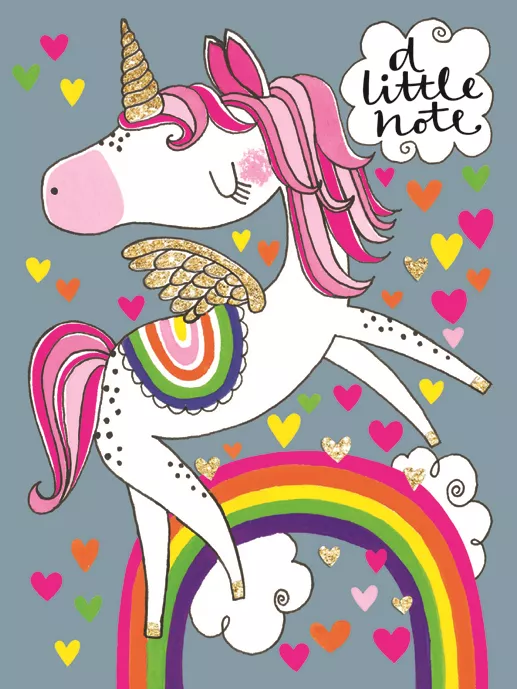 Pack of 5 little note cards and envelopes with a cute unicorn design. Finished with glitter detail.