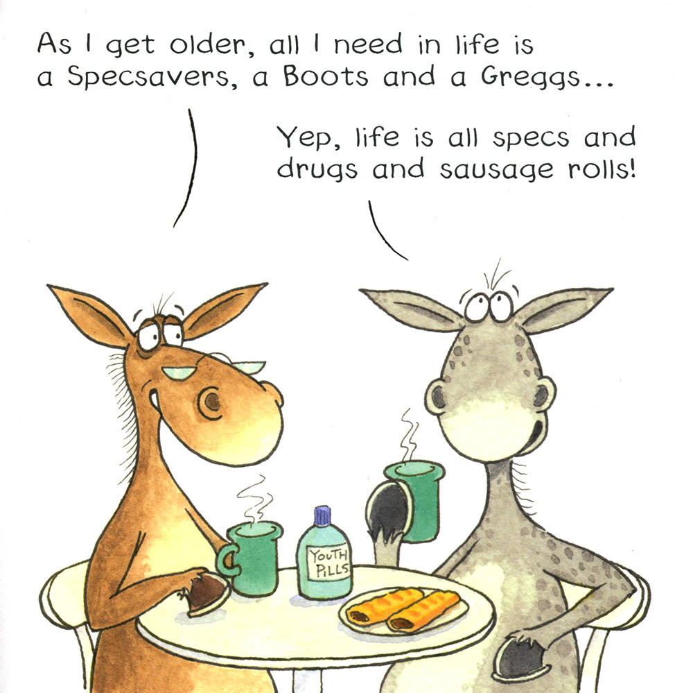 Funny birthday card which features an illustration of two donkeys having a cup of tea and the caption "As I get older, all i need in life is a Specsavers, a Boots and Greggs.... Yep, life if all specs and drugs and sausage rolls!" Made in the UK.