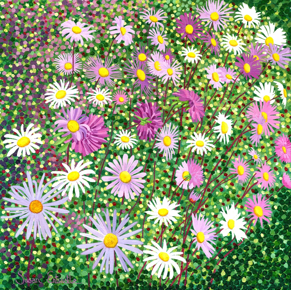 Beautiful floral greeting card featuring an image of pink and white Aster flowers from an original painting by Susan Entwistle. Made in the UK.