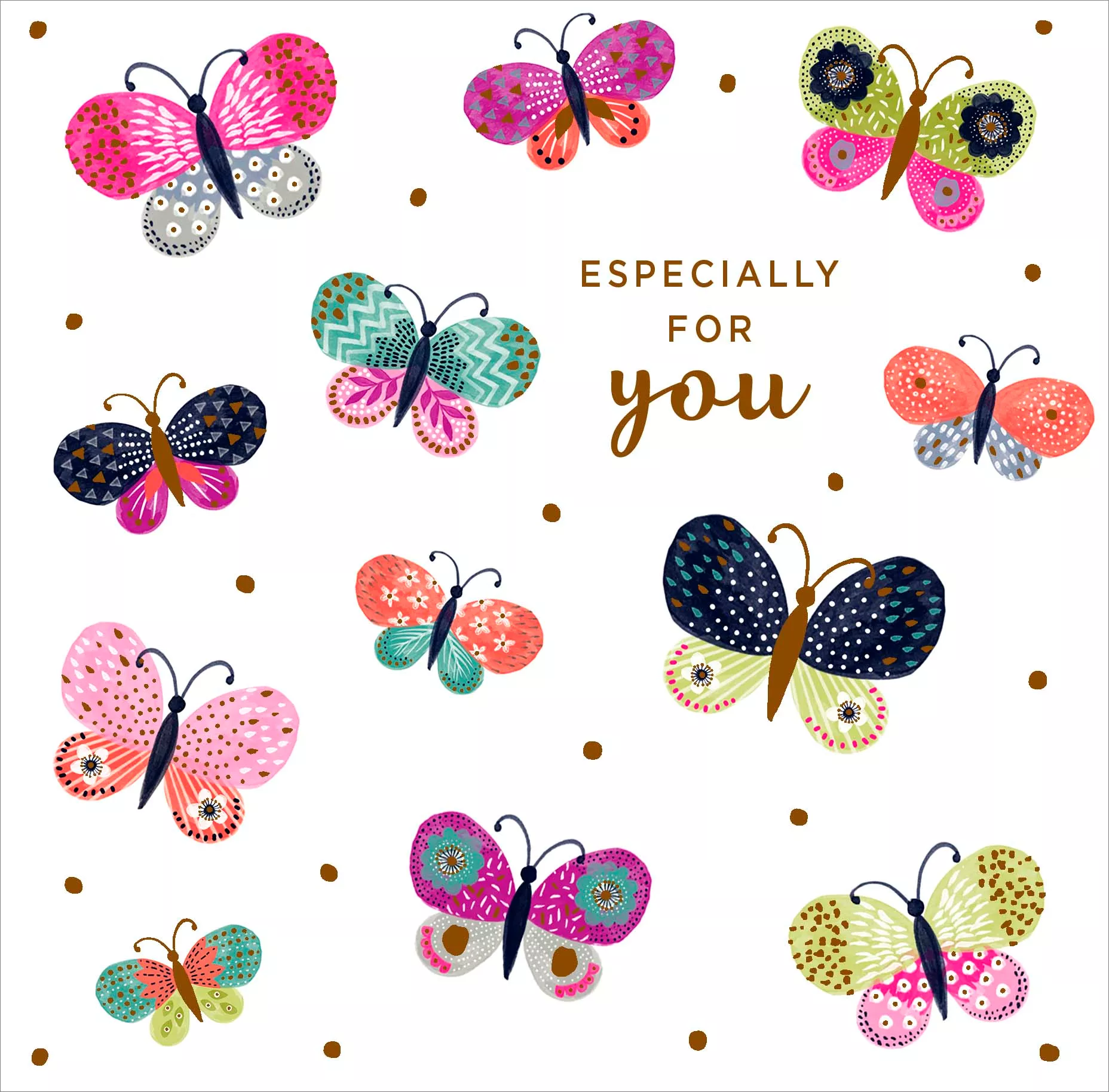 Birthday card with an image of butterflies, finished with gold foil detail. Printed in the UK.
