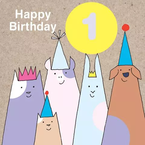 Age 1 birthday card with an image of colourful animals in party hats. Made in the UK.
