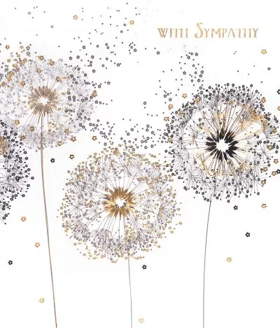 Sympathy card of dandelion plants. 'With Sympathy' in gold foil text