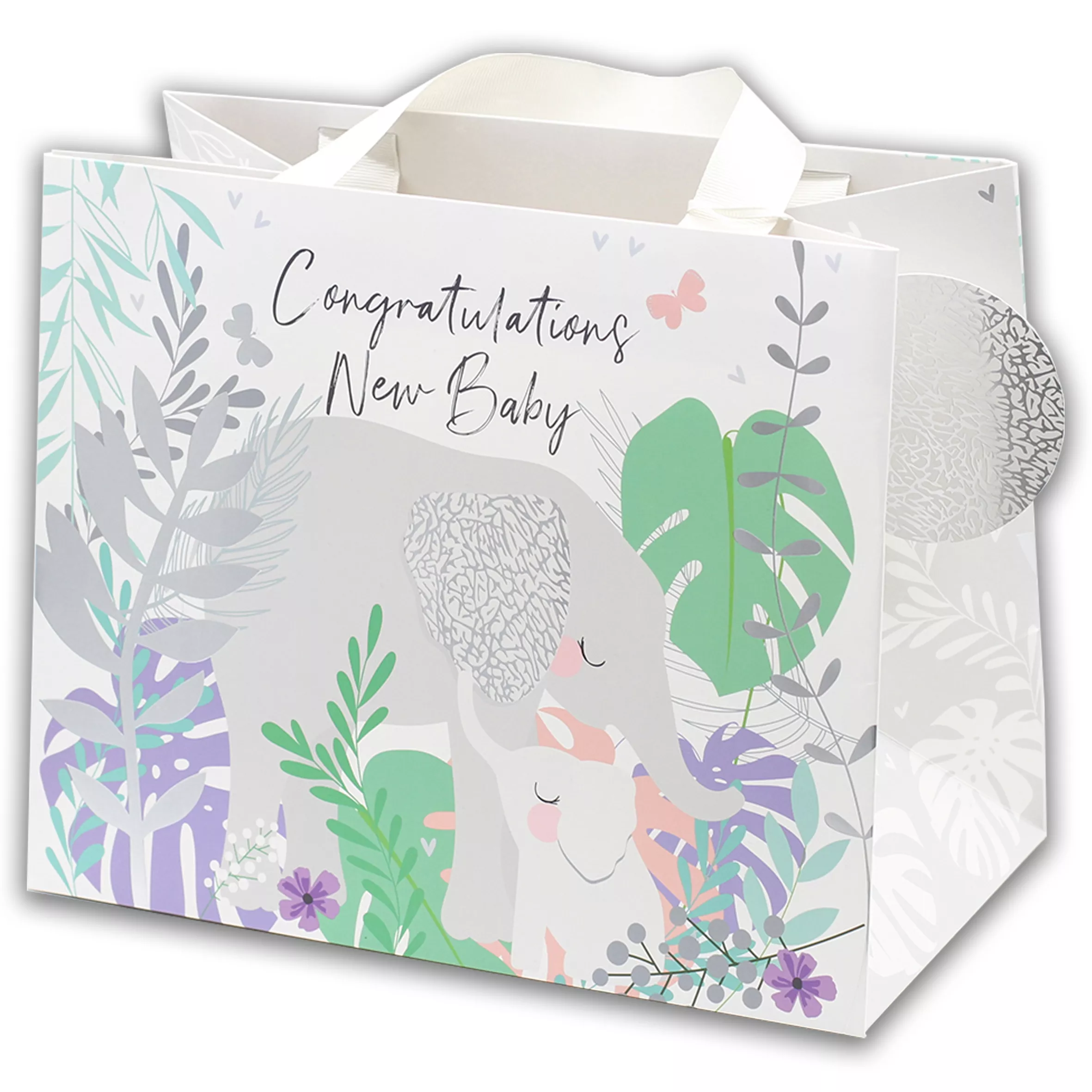 Medium sized gift bag patterned with a elephant and baby. Supplied with a gift tag. Dimensions 275mm x 220mm