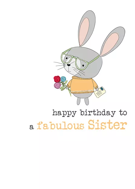 Sister birthday card with an image of a rabbit in a jumper. Finished with glitter detail. This card is designed by the lovely people at Dandelion Stationary in their small Derbyshire studio. It is made with luxury board, sourced from a mill in the Lake District. The envelopes are made from either recycled or FSC paper.
