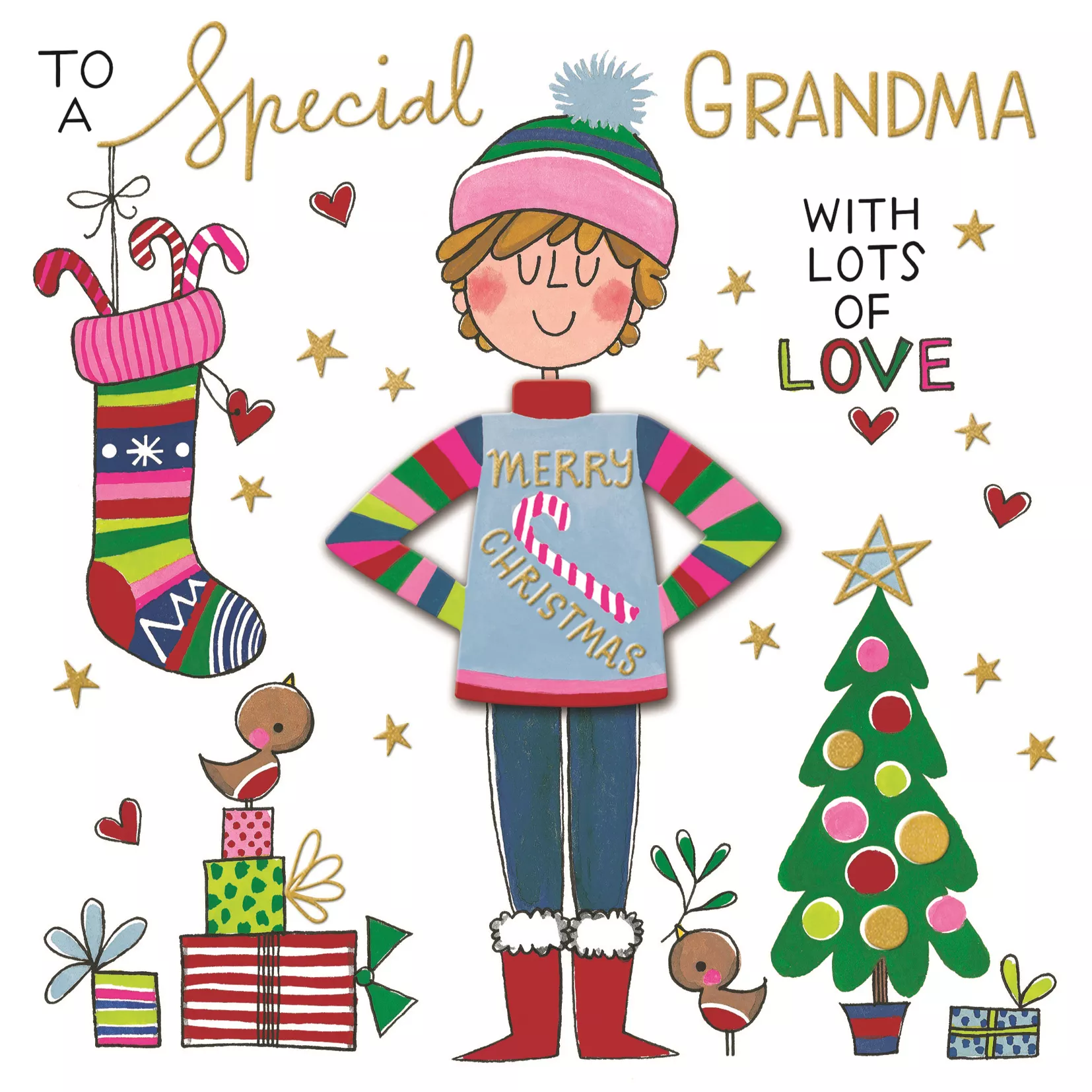 Grandma Christmas card with a fun image of woman wearing a festive jumper. Finished with gold foil detail. Made in the UK.