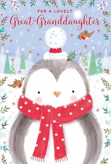 Great granddaughter Christmas card with an image of a fluffy penguin. Finished with red foil detail. Printed in the UK.