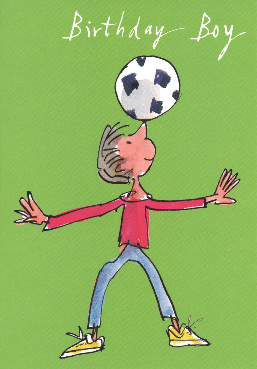 Kids birthday card with a Quentin Blake sketch of a boy playing football.