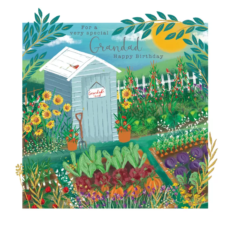 Grandad birthday card with an image of a garden shed. Finished with gold foil detail. Printed in the UK.