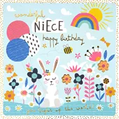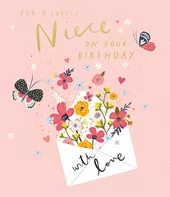 Niece birthday card with an image of a orange cat and pink balloon, finished with gold foil detail. Made in the UK.