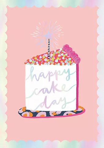 Birthday card with an image of a slice of cake. Finished with silver foil detail. Printed in the UK.