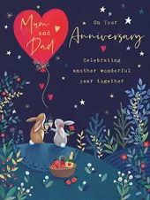 Mum and dad anniversary card decorated with hearts and finished with rose gold foil detail. Made in the UK.