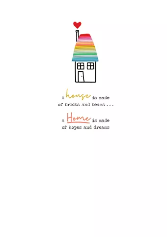 New home card with a lovely image of a rainbow house and the words "A house is made of bricks and beams.. a home is made of hopes and dreams"