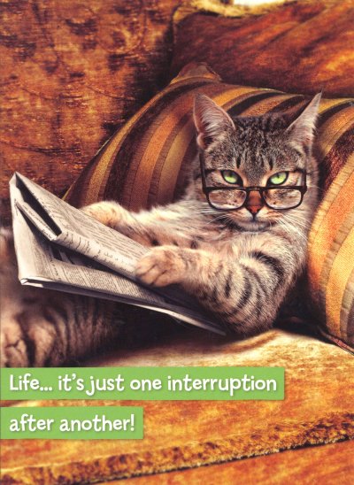 Funny card with a cat reading a newspaper. 'Life... it's just one interruption after another!'