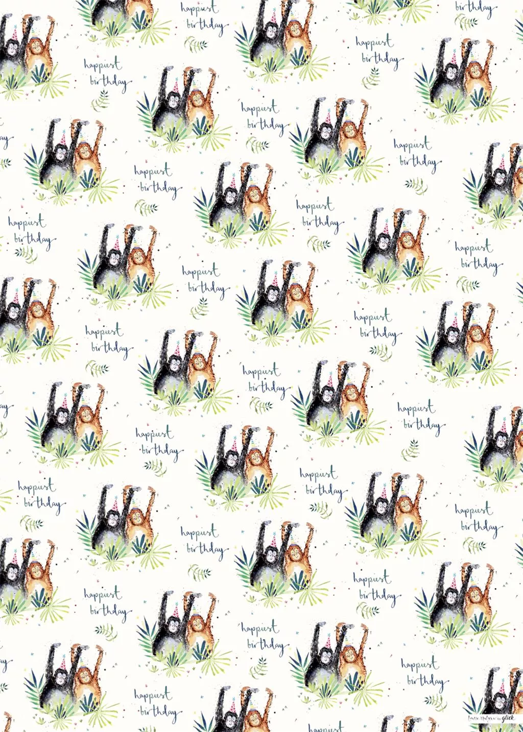 Double sided gift wrap, one side has two orangutans wearing party hats and the other Dimensions: 500x700mm Supplied flat and folded