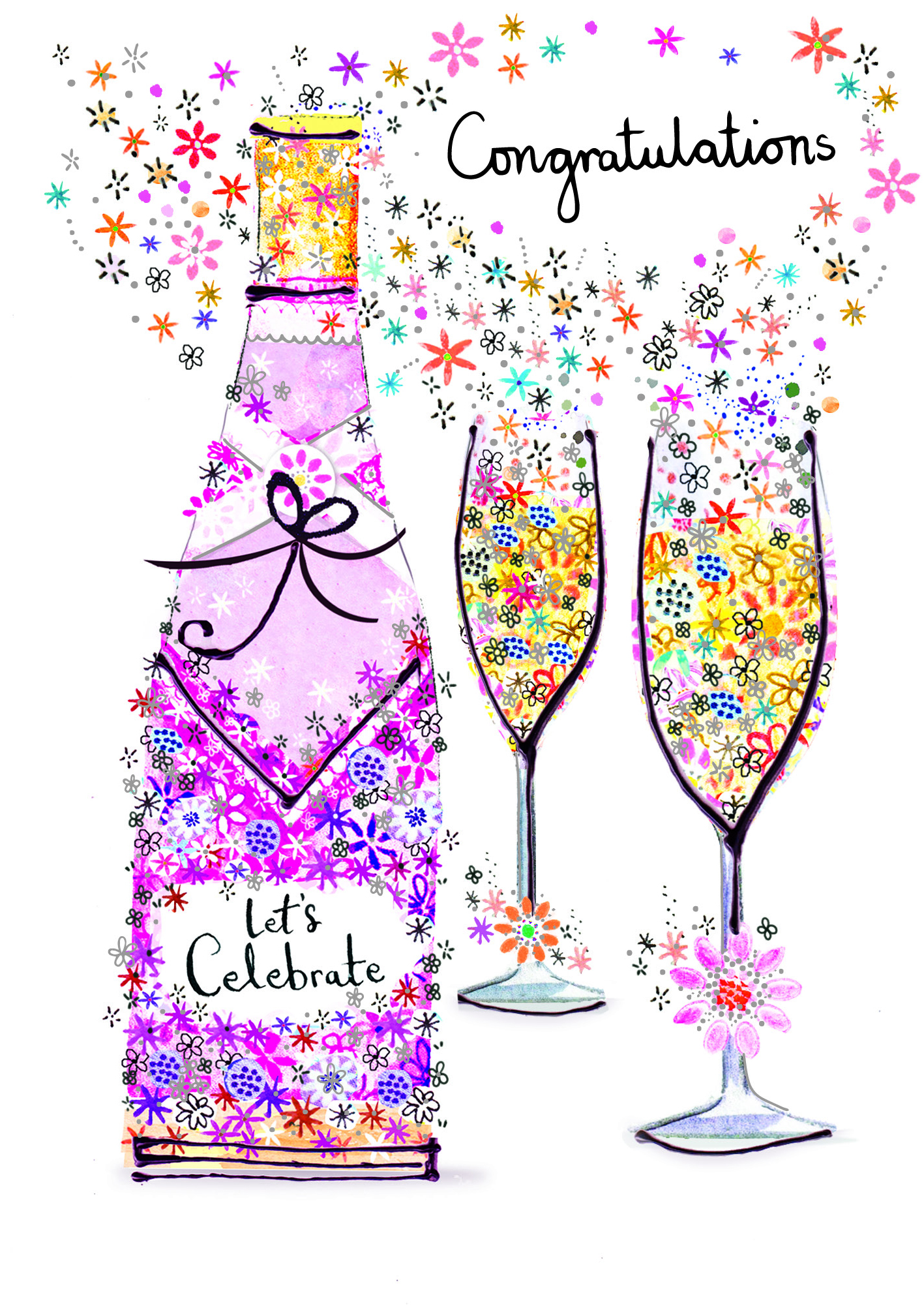 Congratulations card with an image of champagne, finished with silver foil detail. Printed in the UK.