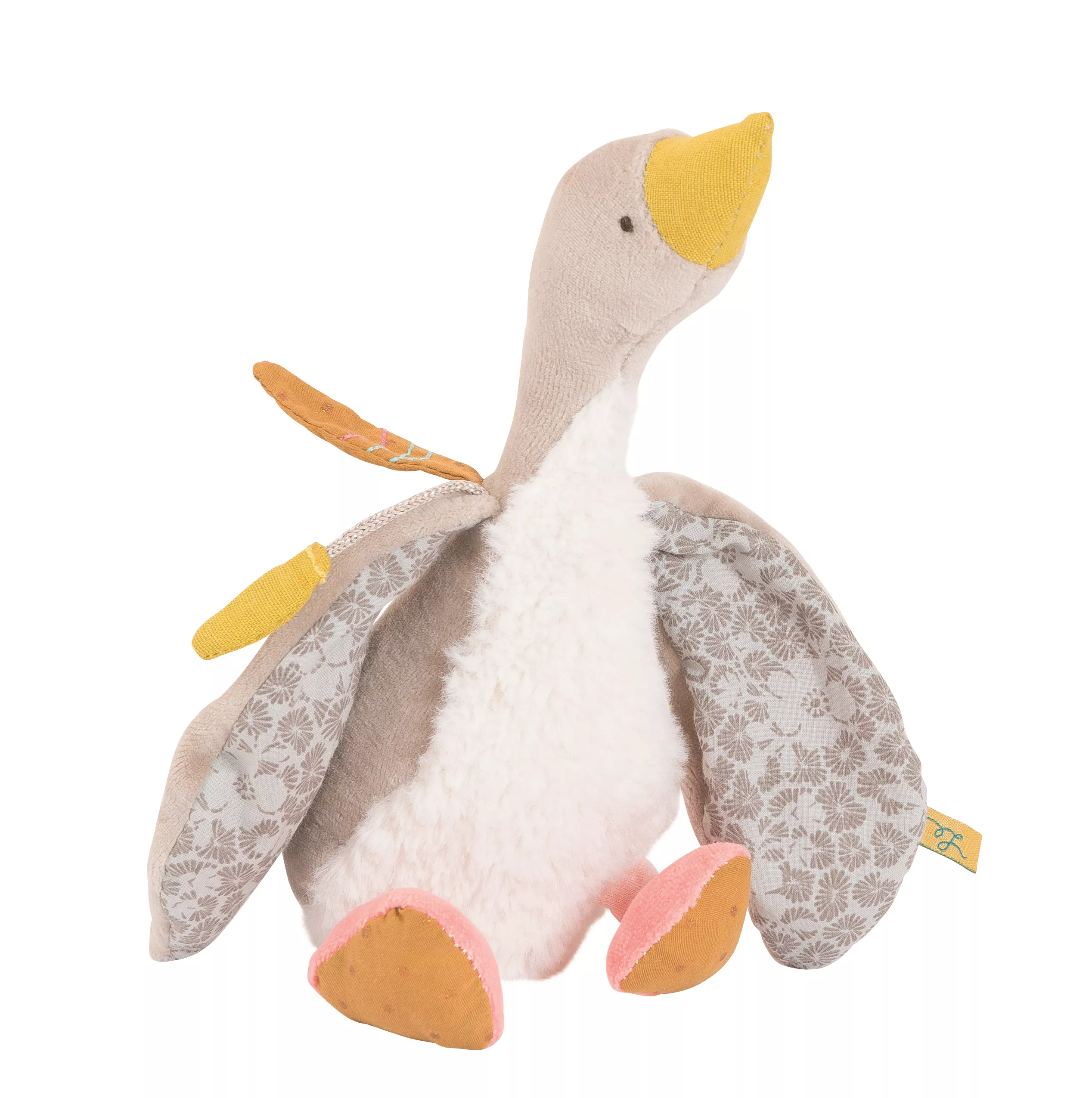 Goose soft toy by Moulin Roty. This lovely goose cuddly toy has a soft white tummy, beige plush head and body, pink feet and a mustard coloured beak made from linen. This Moulin Roty soft toy is suitable from 10 months. Approx height 23 cm and machine washable on a delicate cycle.