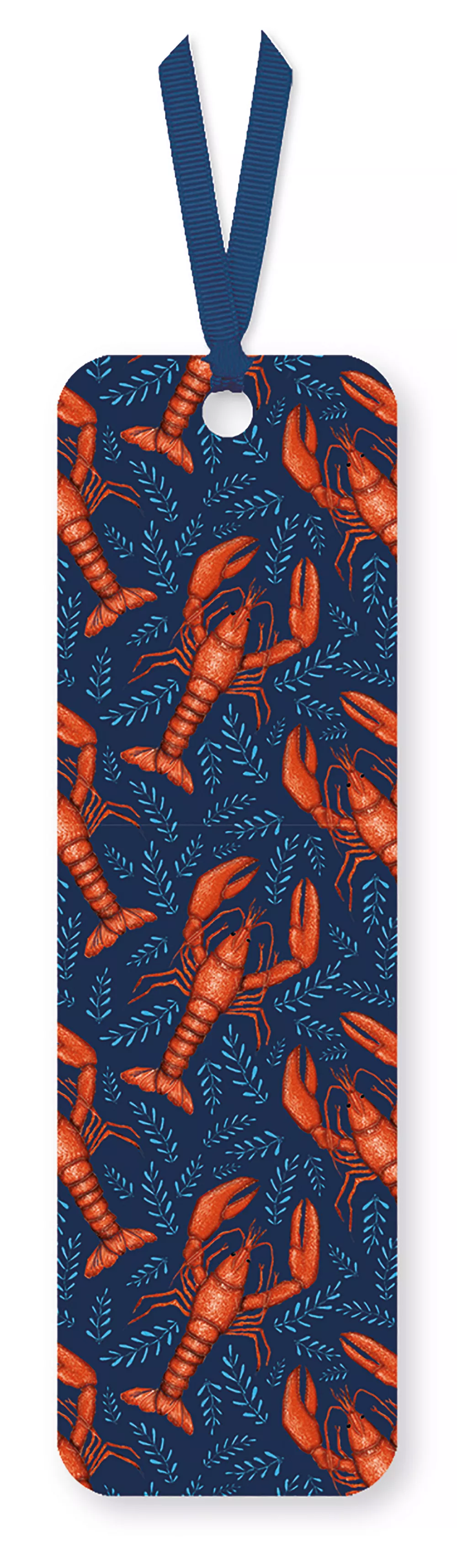 A beautiful cardboard book mark with a ribbon tag featuring an illustration of lobsters.
