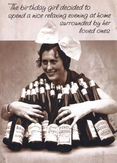 Funny birthday card of a woman clutching lots of bottles of wine and the text "The birthday girl decided to spend a nice relaxing evening at home surrounded by her loved ones" Made in the UK.