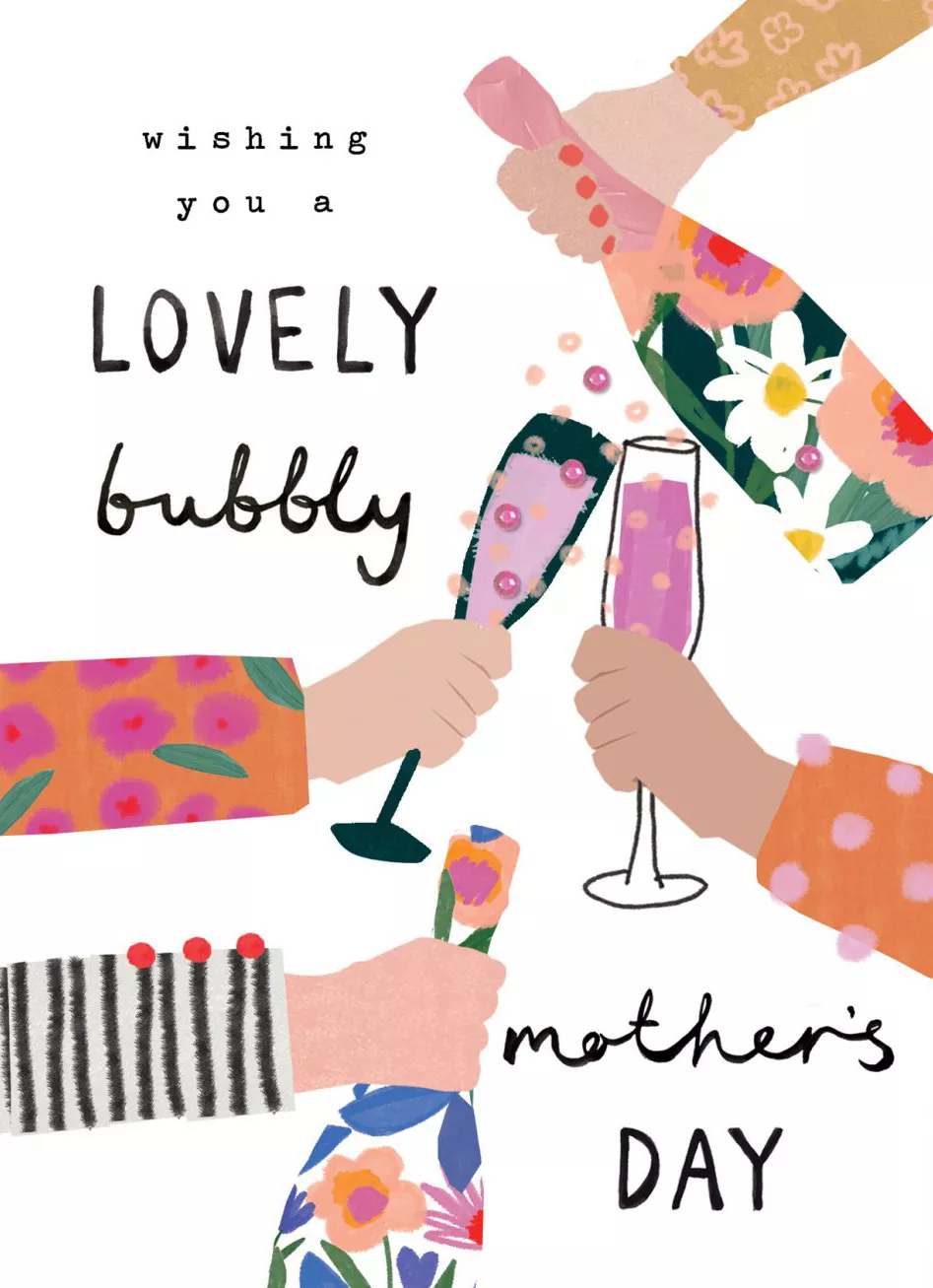 Mother's Day Card with bottles and glasses of bubbly, the card has pink embellishments. Made in the UK.