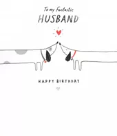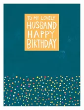 Colourful husband birthday card by Lucilla Lavender decorated with balloons and hearts. Made in the UK.