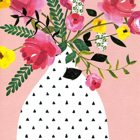 Blank inside greeting card suitable for any occasion with an image of flowers in a spotted vase. Finished with gold foil detail. Made in the UK.