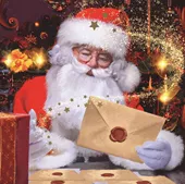 Personalised Christmas card with a Santa holding presents and a lantern. Finished with a gloss varnish.