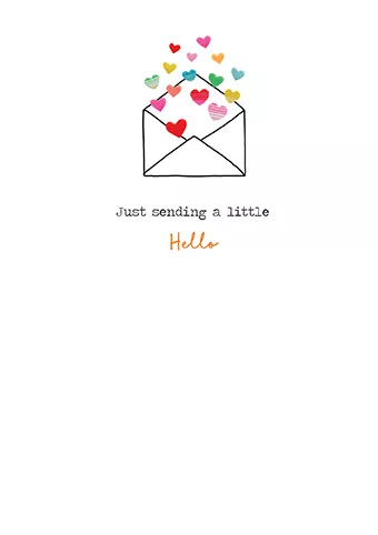 Thoughtful greeting card with a image of an envelope with rainbow hearts pouring out. With the words "just sending a little hello"