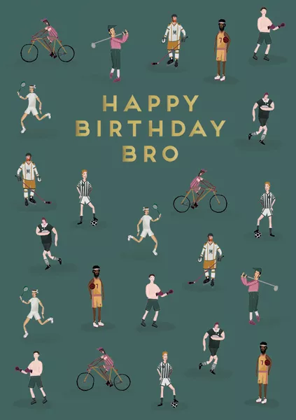Brother Birthday Card with small sports characters. 'Happy Birthday Bro.' Made in the UK.