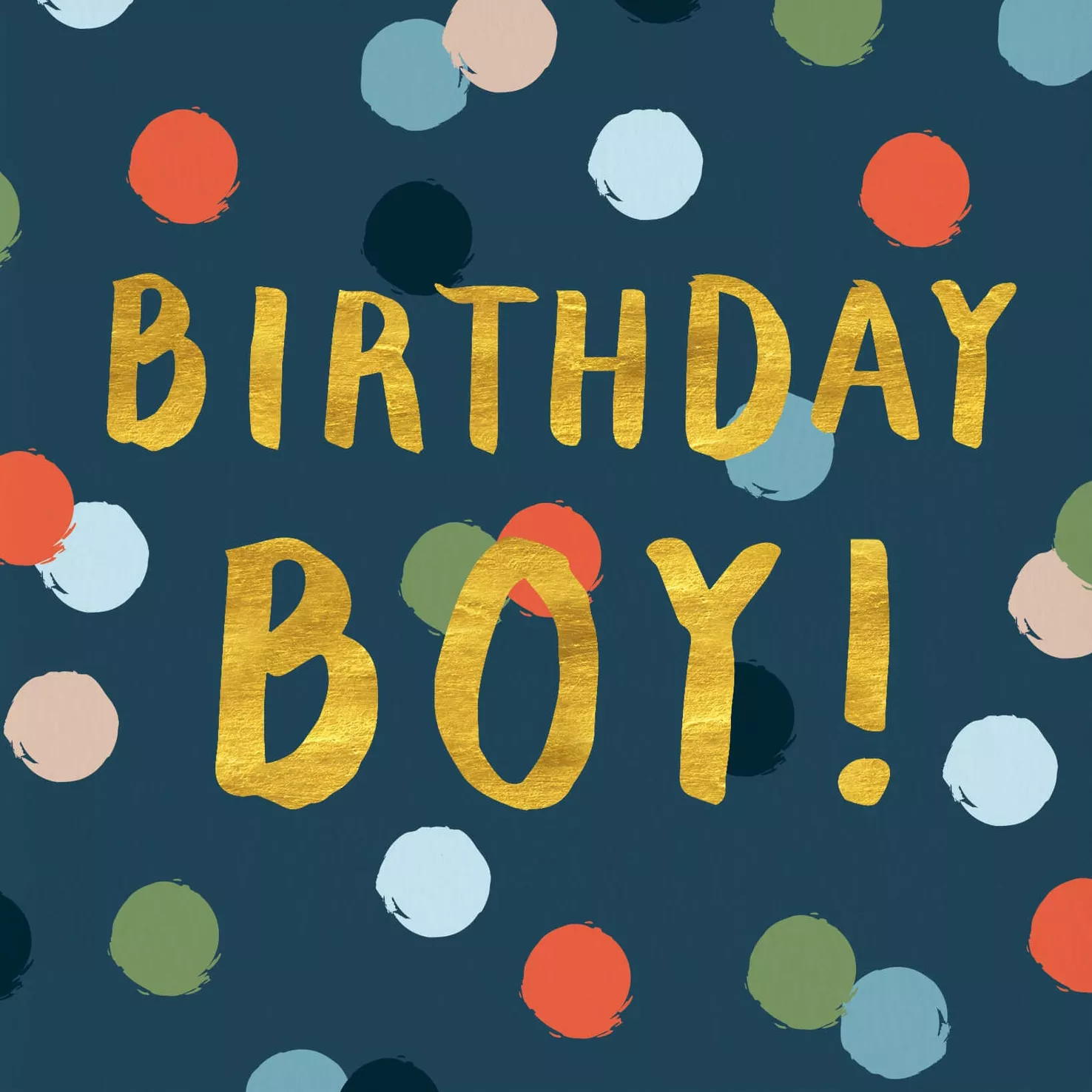 Birthday card with an image of colourful spots. Finished with gold foil detail. Printed in the UK.