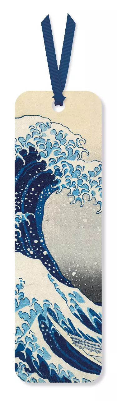 A beautiful cardboard book mark with a ribbon tag featuring an illustration of Under the Wave, off Kanagawa ('The Great Wave')