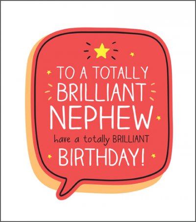 Nephew birthday card by Happy Jackson with the words "to a totally brilliant nephew have a totally brilliant birthday" in a red speech bubble. Made in the UK.