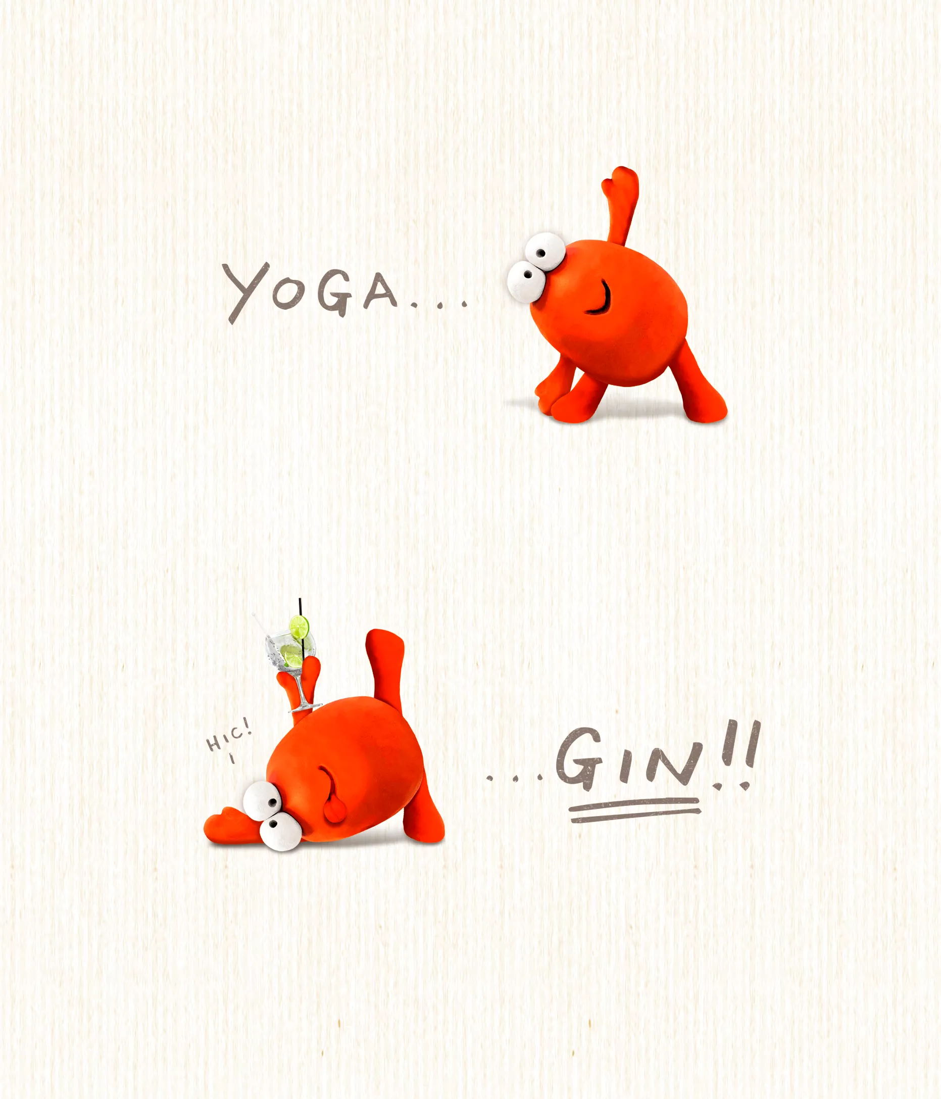 Birthday card with an image of a little blob doing yoga and drinking gin. Made in the UK.