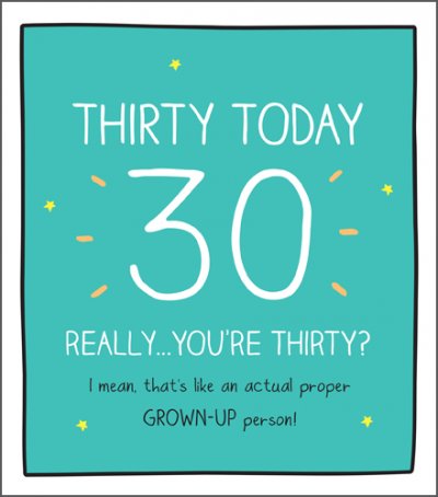 30th birthday card by Happy Jackson with the words "Thirty today really... you're thirty? I mean that's like an actual proper grown up person!" Made in the UK.